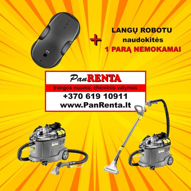 Nuomokitės plaunamajį siurblį KARCHER PUZZI (1 tab. chemijos iskaičiuota) ir langų valymo robotu naudokitės 1 parą NEMOKAMAI!